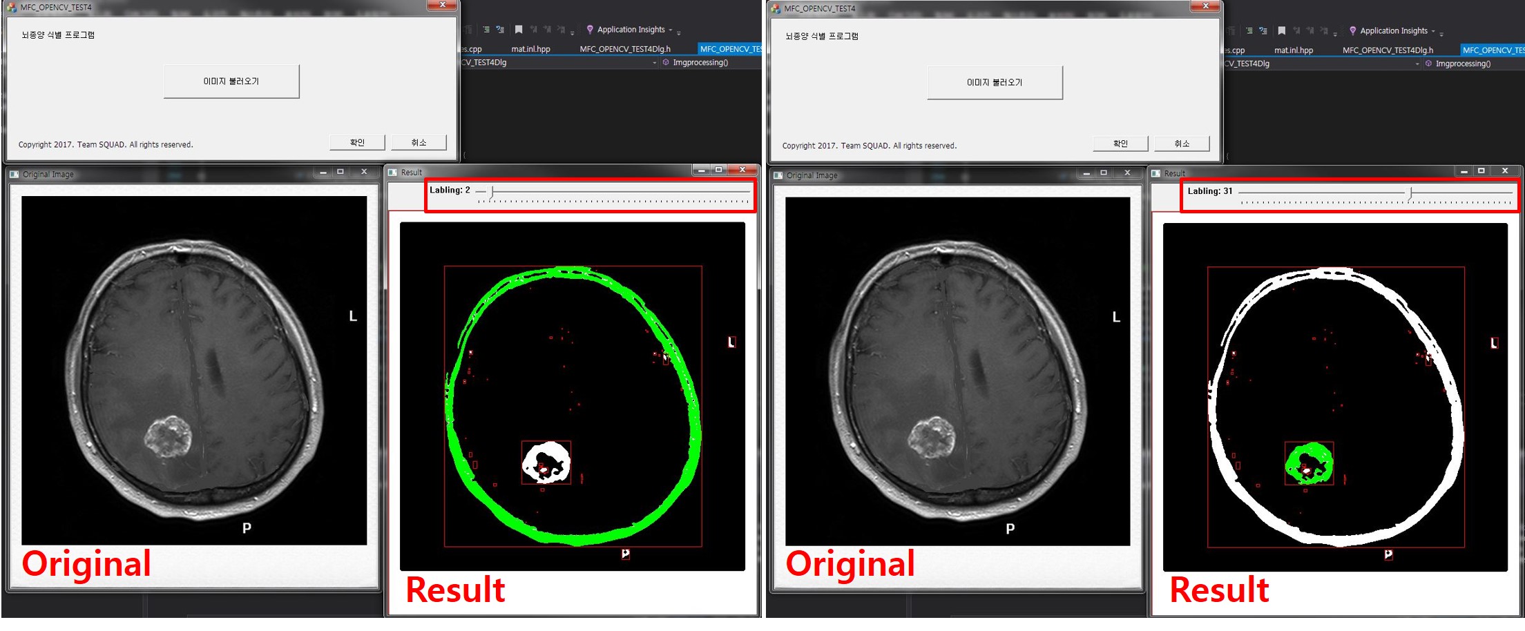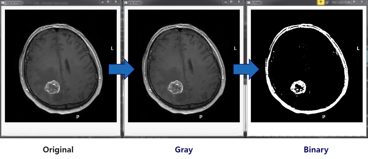 이미지처리를 이용해 DICOM 영상에서 뇌종양 부위 식별에 도움을 주는 알고리즘을 개발함. DICOM 영상데이터를 OpenCV에서 처리가능한 데이터로 변환하고, 이진화 및 모폴로지를 통해 전처리함. 실제 뇌종양 영역의 데이터 분포와 비슷한 양상의 영역을 후보군으로 검출하여 뇌종양 영역 식별을 용이하게함.