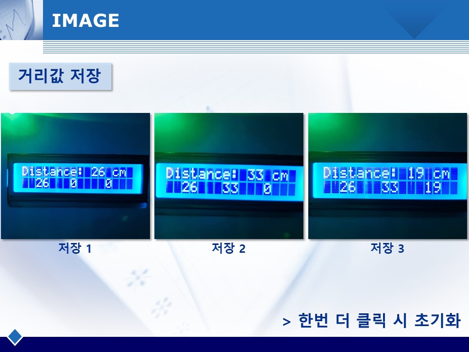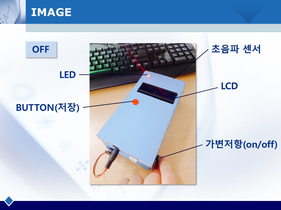 줄자 없이 원거리에서 사물의 크기나 거리를 측정하기 위한 아두이노 기반 장치 개발. 초음파 센서로부터 측정된 값을 cm단위로 변환하여 모니터를 통해 실시간으로 보여줌. 배터리를 통해 동작하며 버튼을 클릭하여 거리값을 저장함(동시 최대 3개).