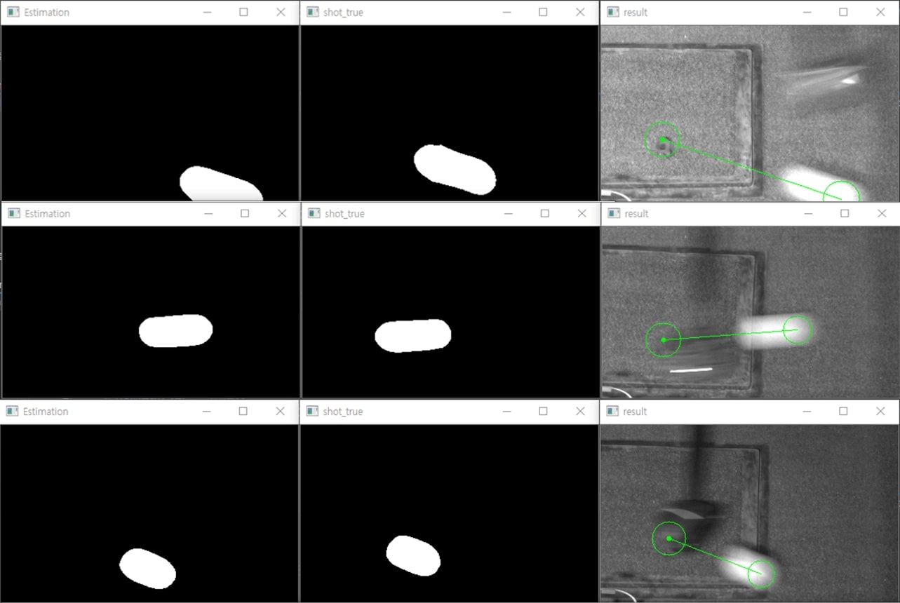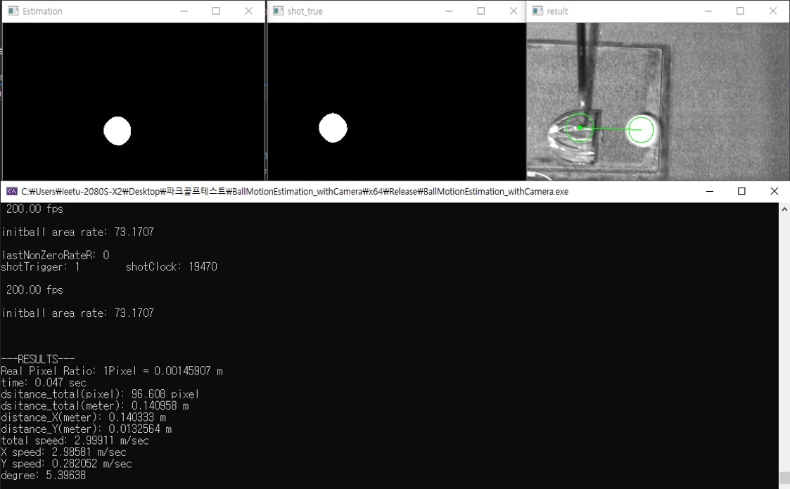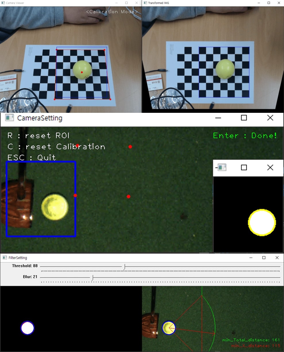 비전센서 기반 공 추적 알고리즘으로, C++ 기반 OpenCV를 활용하여 실시간 영상에서 파크골프 공을 추적하여 레디-샷 상태를 분석 및 감지하고 공의 상대적 위치변화를 이용해 출발속도를 계산함. 초기 설정 함수를 통해 고정된 환경이 아닌 이동식 부스와 같이 다양한 카메라 자세 또는 밝기 변화에 대응 가능하며 DLL로 빌드하여 Unity 등 외부 게임 엔진 연동에 최적화함.