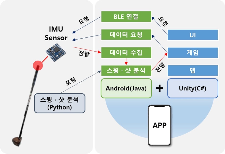 모바일 파크골프 시스템은 스크린 파크골프 게임의 모바일 버전으로, 공 없이 BLE 통신으로 연결된 골프채의 스윙궤적 추정만으로 공의 움직임을 구현함.