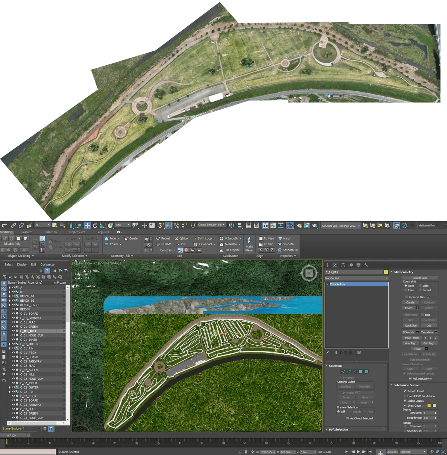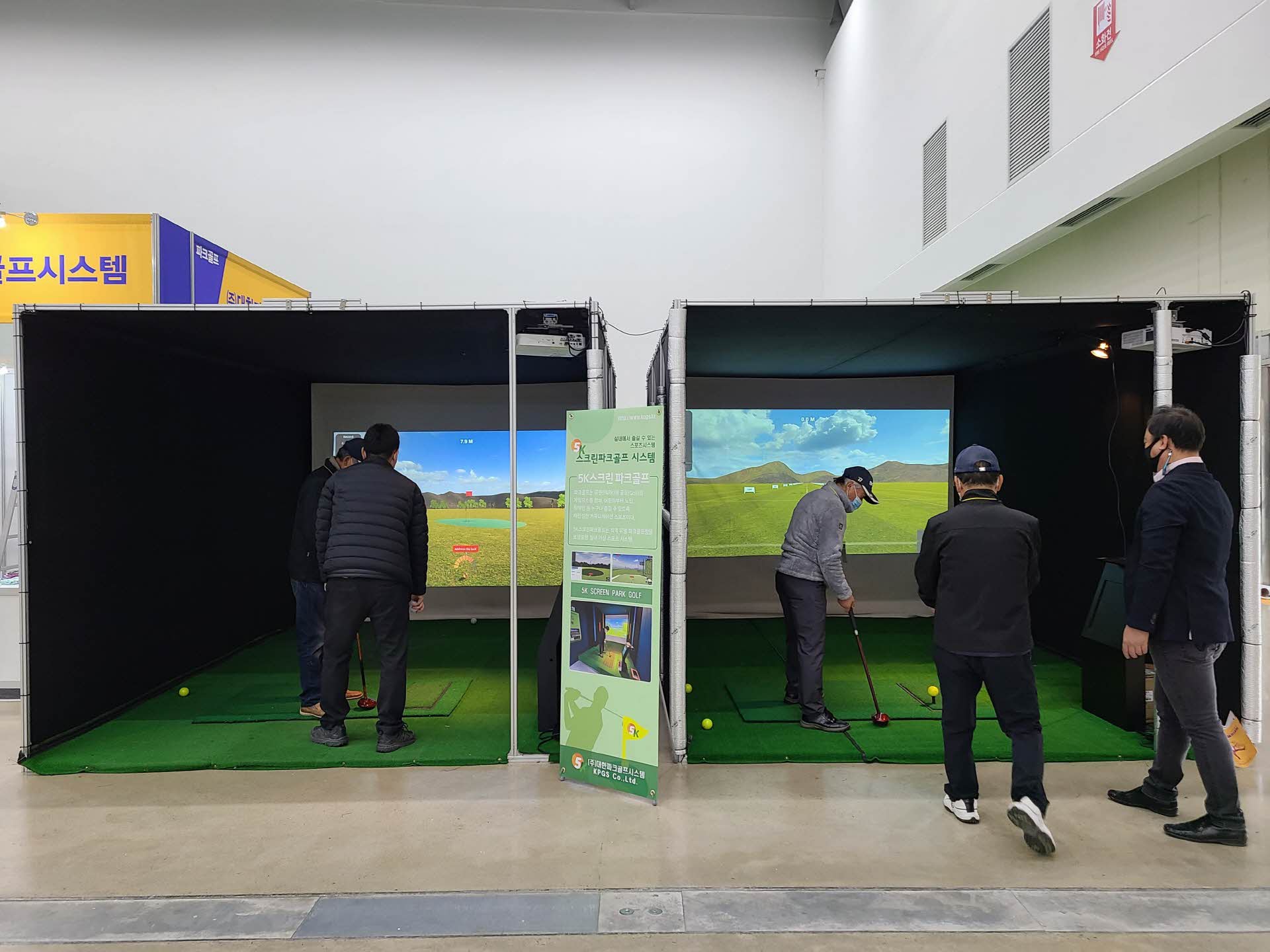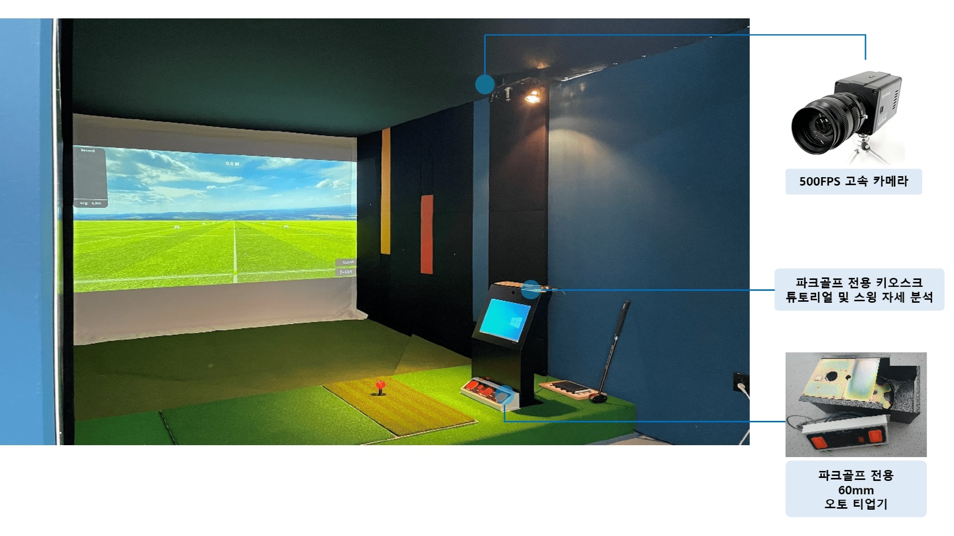 스크린 파크골프 시스템은 실내 스크린을 통해 즐길 수 있는 가상 파크골프 게임으로, 카메라를 이용한 공 추적 기술을 기반으로 함. 실제 경기장을 모델링하여 제작, 실데이터를 반영하여 실제와 같은 공의 움직임을 구현함. 해당 시스템을 직영/비직영 매장에 출시하여 사용자들에게 서비스함.