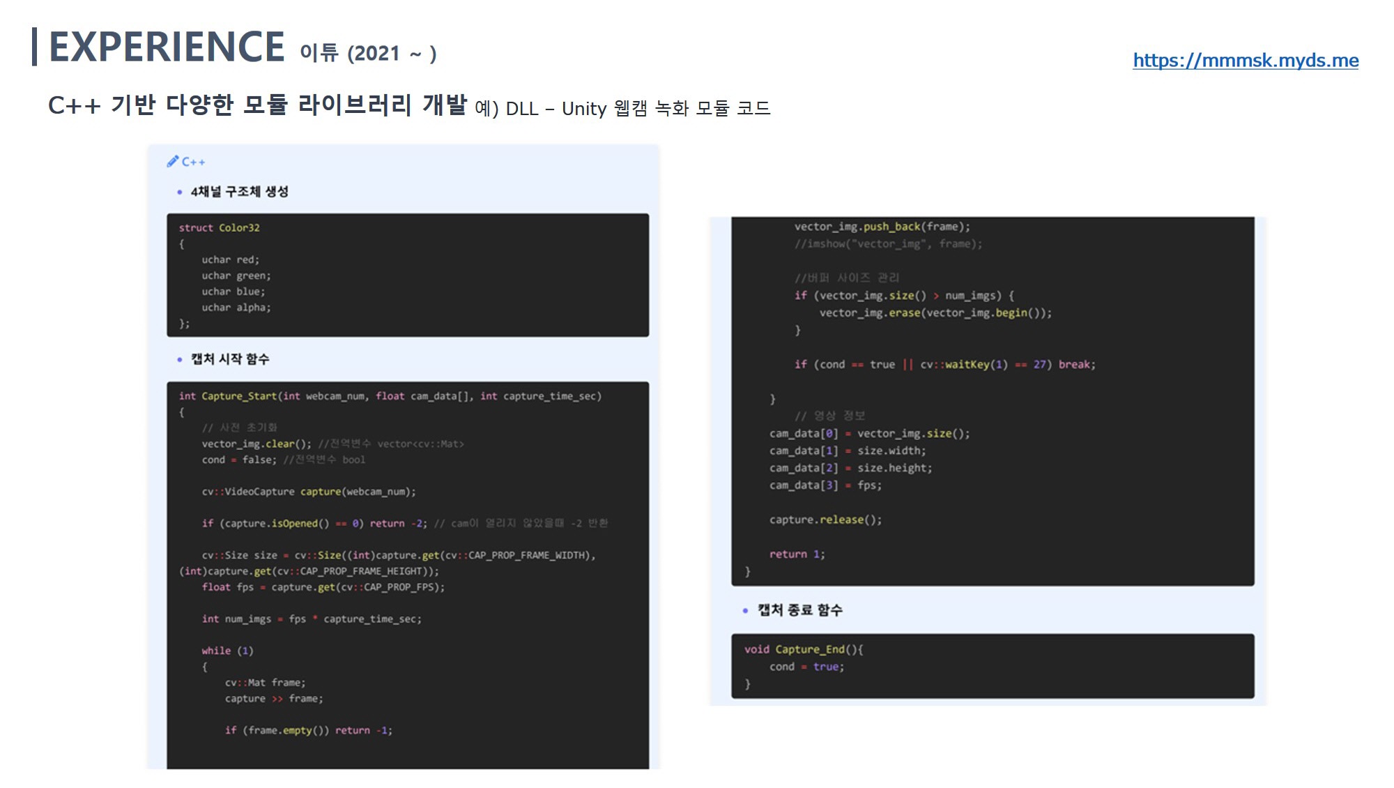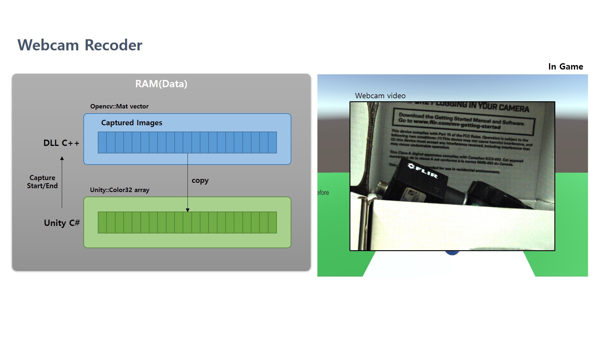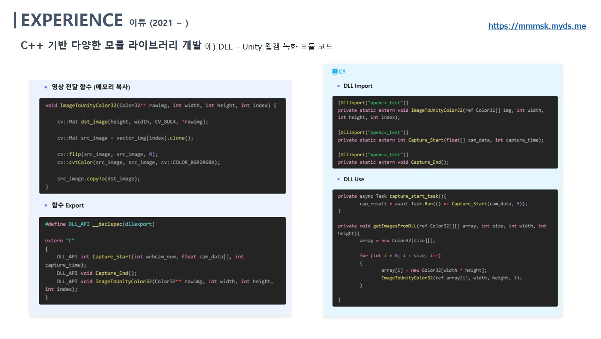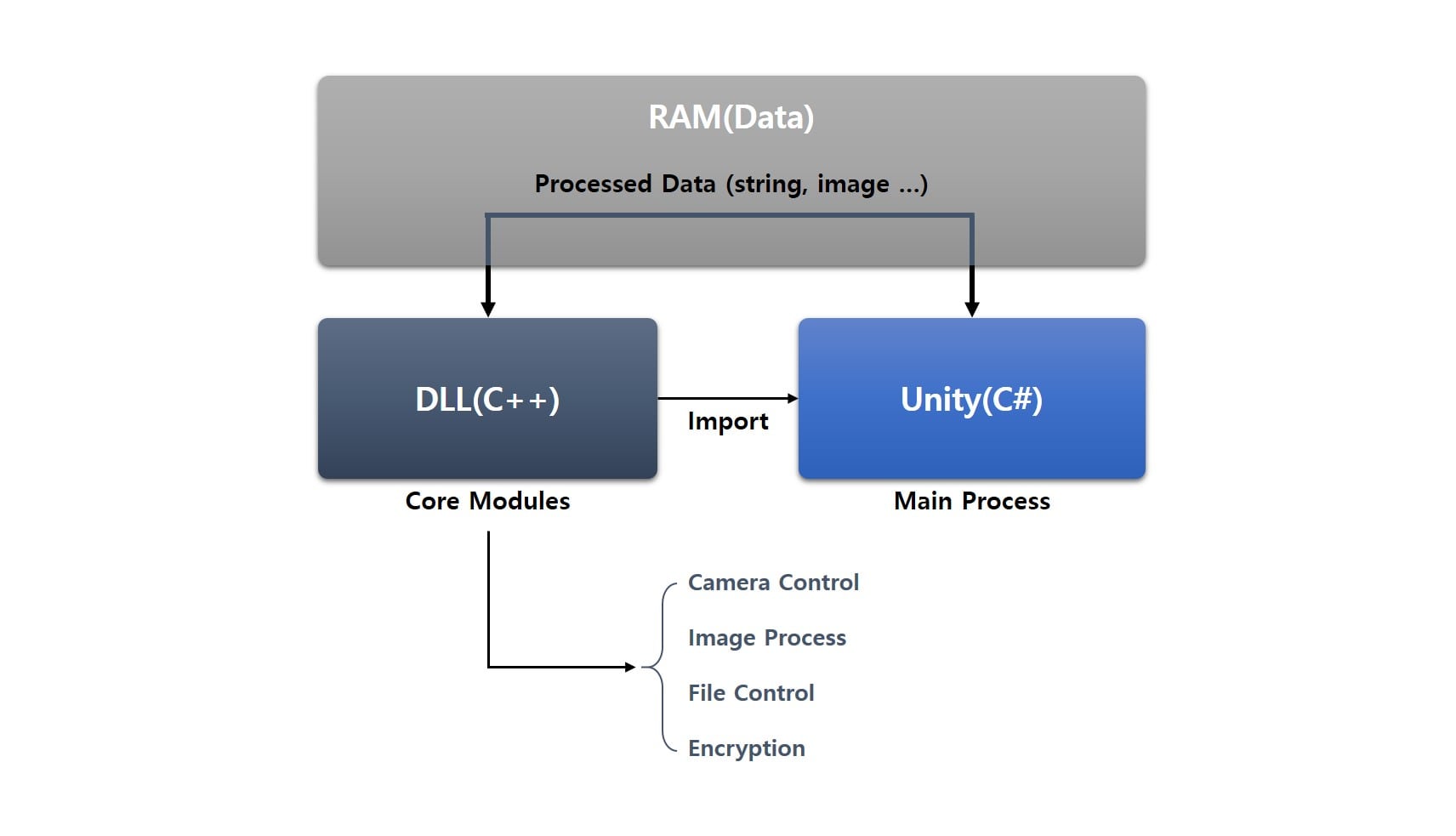 Unity C# 또는 Python과 같은 스크립트 개발환경에서 복잡하거나 고성능의 기능을 요구사항에 맞게 C++ DLL로 구현하여 연동함. 특히 카메라제어, 이미지처리, 데이터교환 등의 기능을 구현하고 처리된 데이터를 마샬링을 통해 전달함.