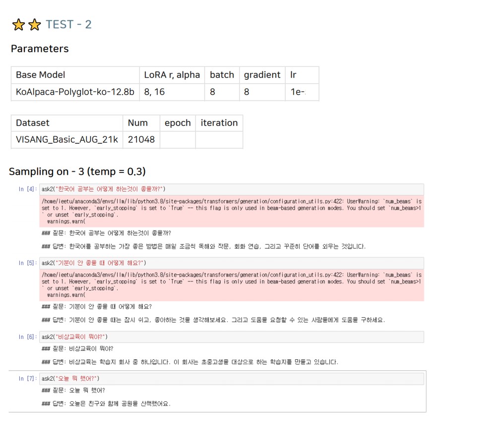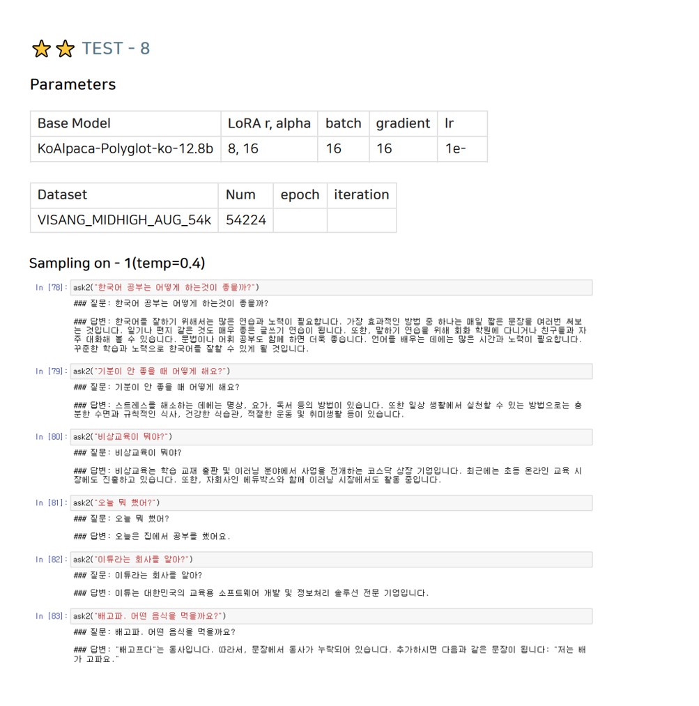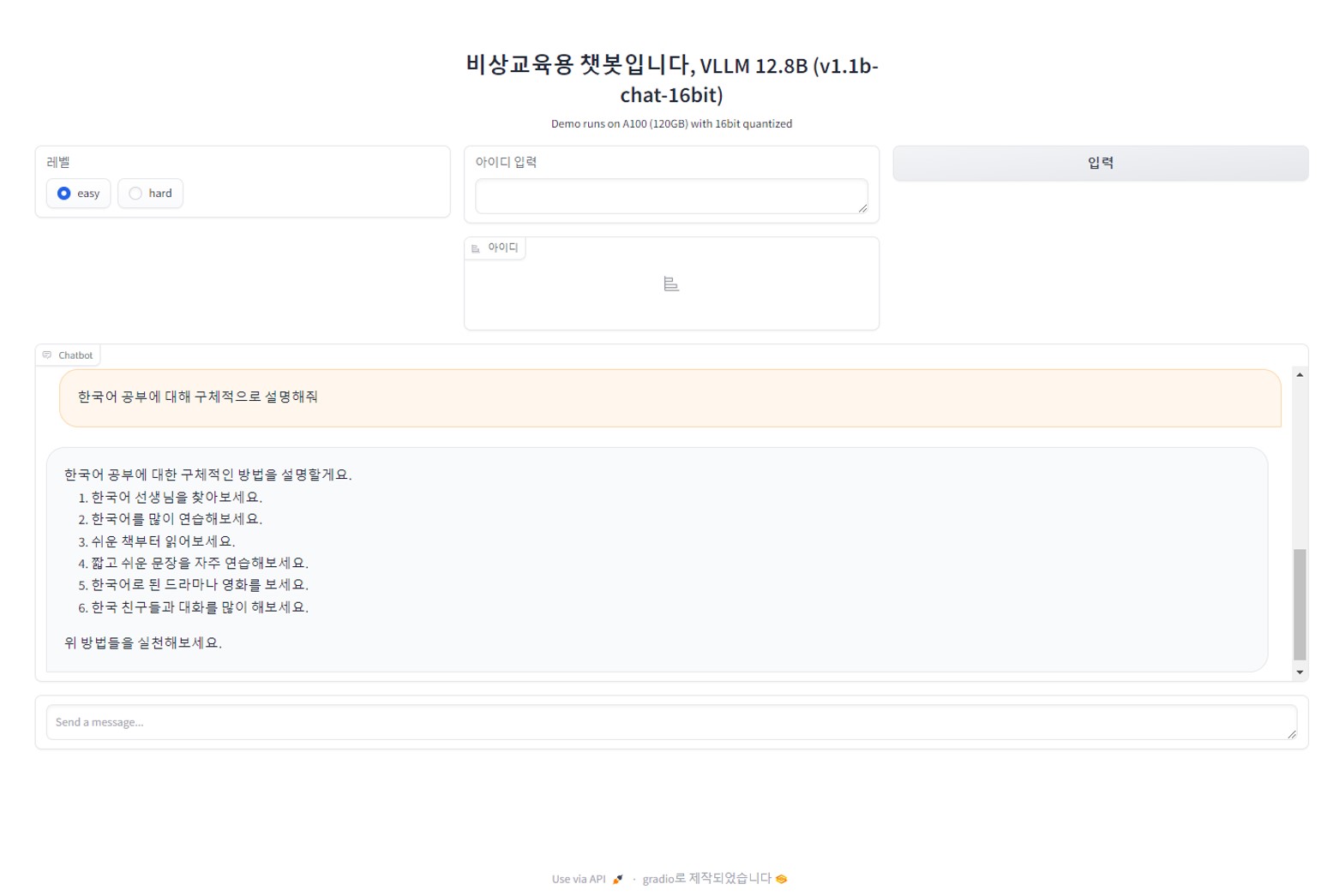 비상교육의 한국어 교육용 데이터셋을 활용해 난이도별(초급, 중고급) 대화형 챗봇 서비스 개발. 한국어 기반 언어모델 KoAlpaca-Polyglot-ko 12.8b 를 베이스 모델로하여 커스텀 데이터셋을 사용, LoRA 학습 기법을 통해 파인튜닝함. KorQuAD 데이터셋을 활용하여 모델을 평가하고 LangChain 프레임워크의 일부 기능을 수정 및 적용하여 서비스함.
