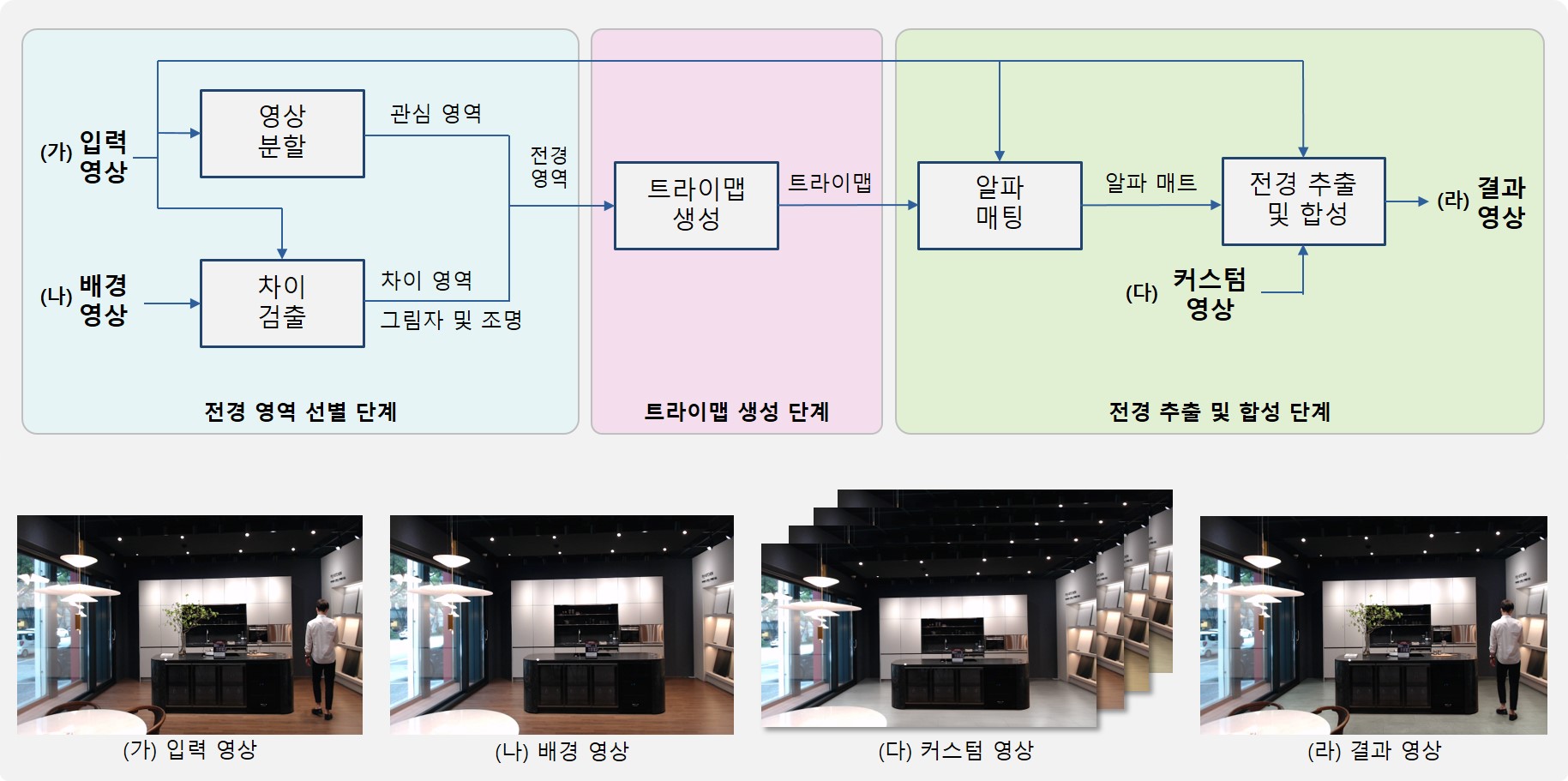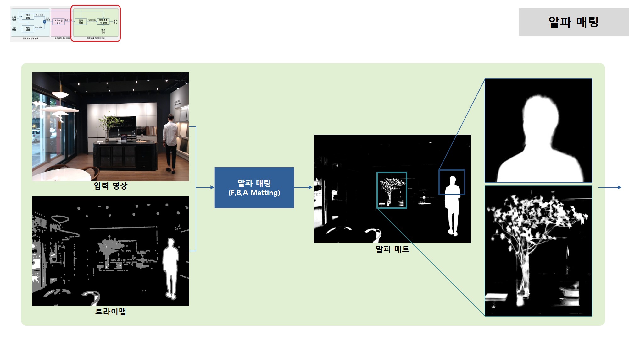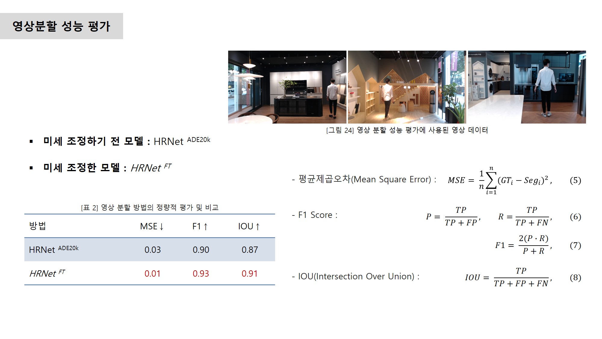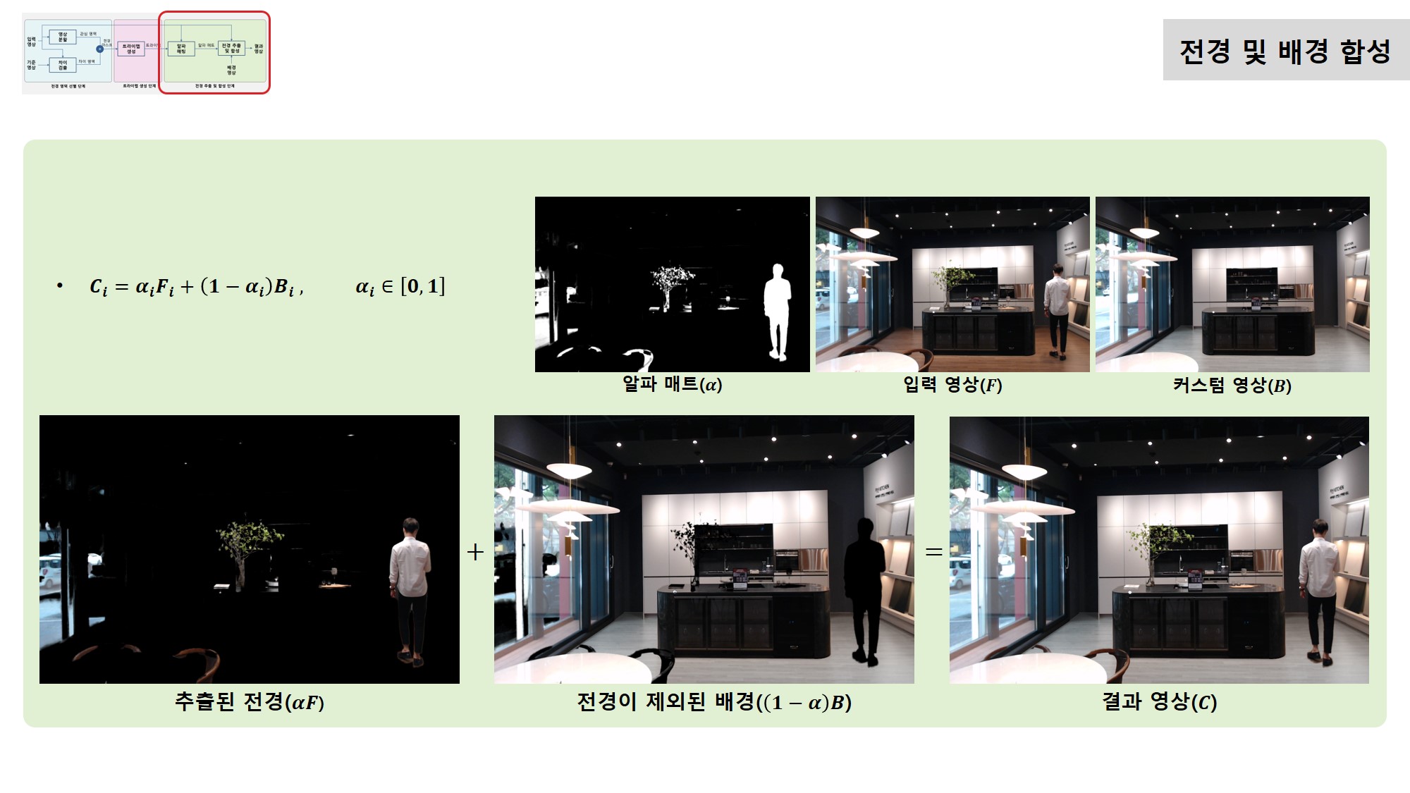 가상 인테리어 증강 방법은 실내 영상에서 영상분할(Image Segmentation)을 통해 증강할 객체를 구별하고, 알파매팅(Alpha Matting)을 이용한 증강객체의 자연스러운 합성을 통해 이질감 없는 가상 인테리어를 제공함. HRNet 기반 영상분할 방법과 F.B.A Matting 방법을 해당 시스템에 최적화하여 사용함.