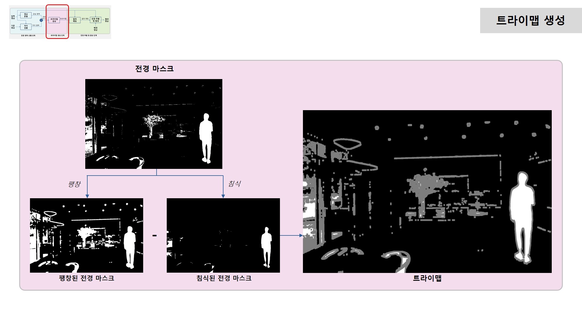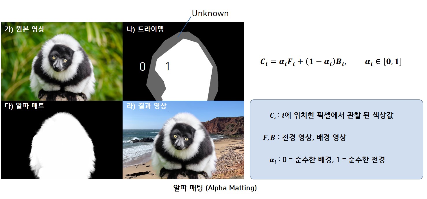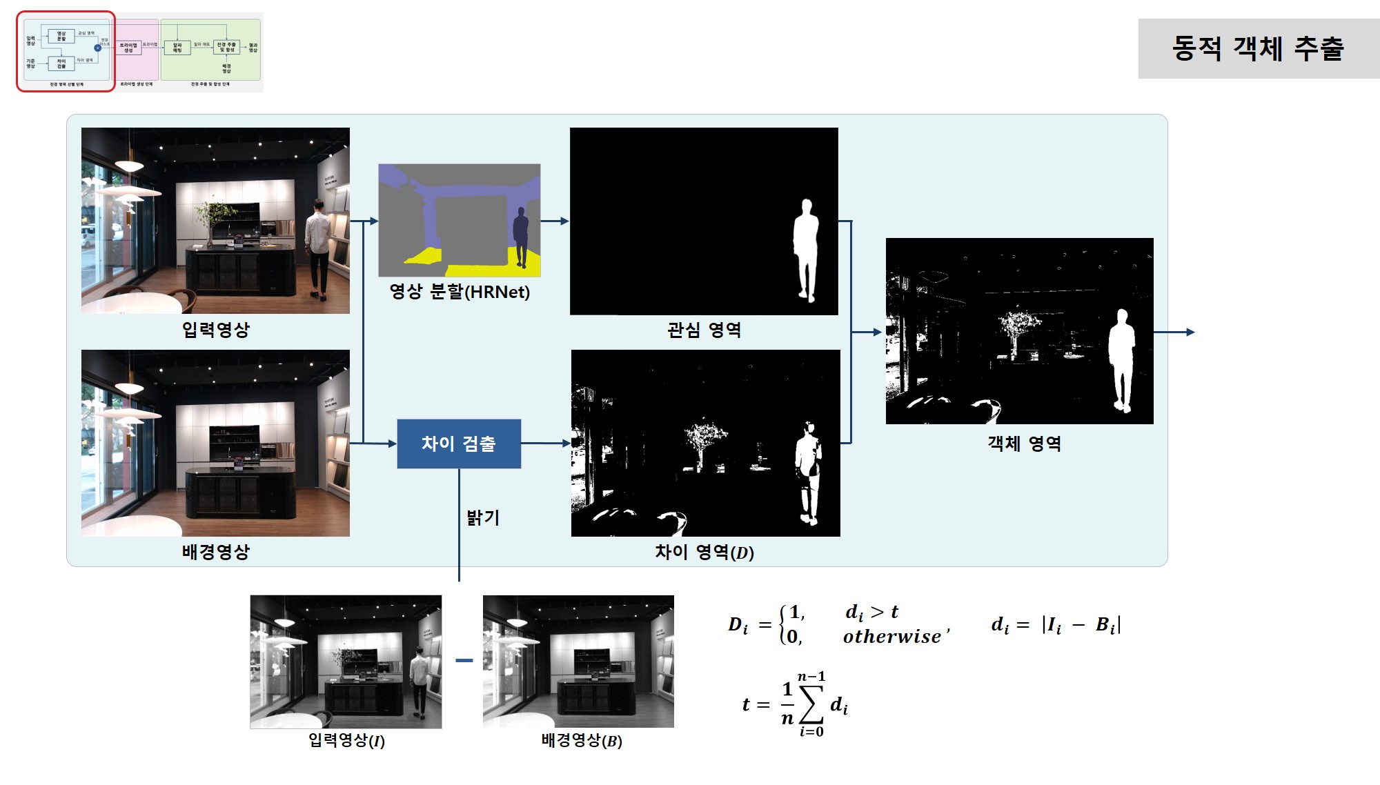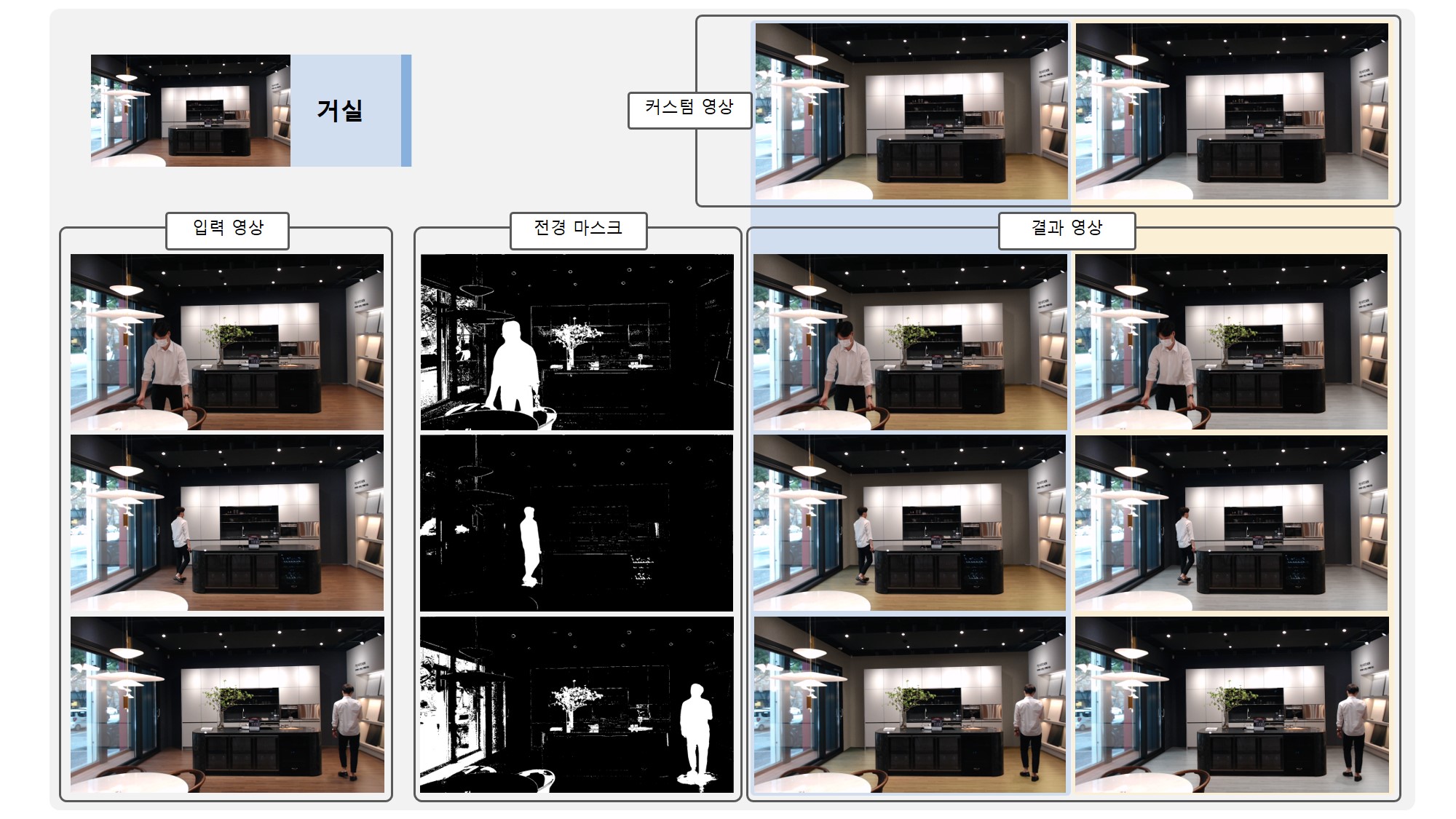 가상 인테리어 증강 방법은 실내 영상에서 영상분할(Image Segmentation)을 통해 증강할 객체를 구별하고, 알파매팅(Alpha Matting)을 이용한 증강객체의 자연스러운 합성을 통해 이질감 없는 가상 인테리어를 제공함. HRNet 기반 영상분할 방법과 F.B.A Matting 방법을 해당 시스템에 최적화하여 사용함.