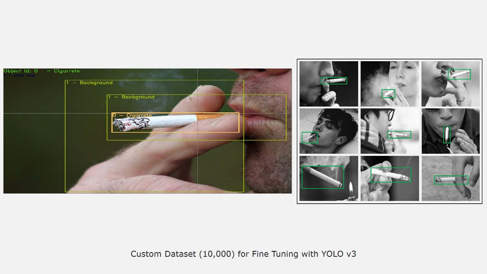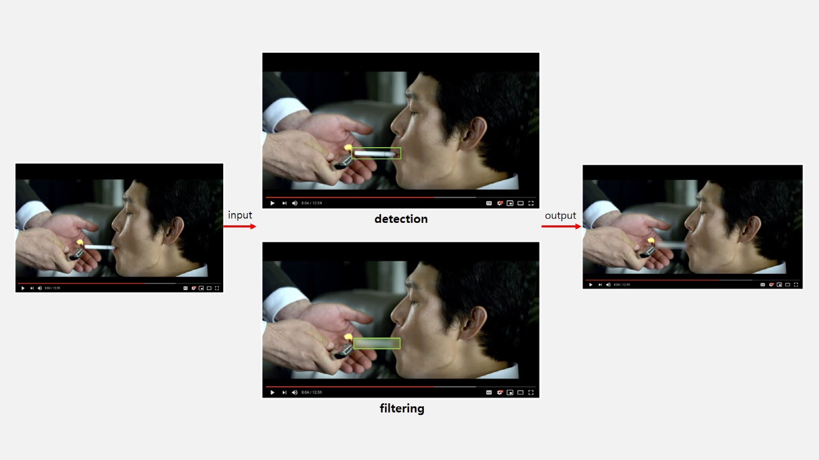 커스텀 데이터셋으로 학습된 YOLO v3 모델을 이용해 흡연장면에서 담배를 검출하여 해당 영역을 필터링(블러링)함. 커스텀 데이터셋은 웹 크롤링을 통해 얻은 흡연장면 영상 약 8,000장을 라벨링한 것으로, 사전학습된 모델을 2개의 클래스로 Fine tuning하여 사용함.