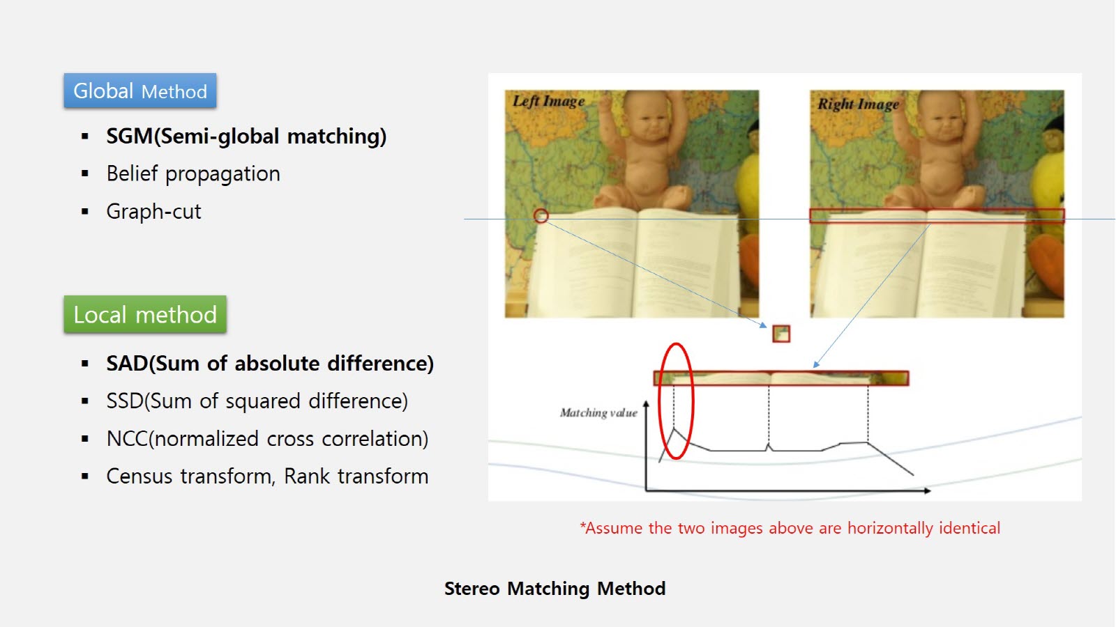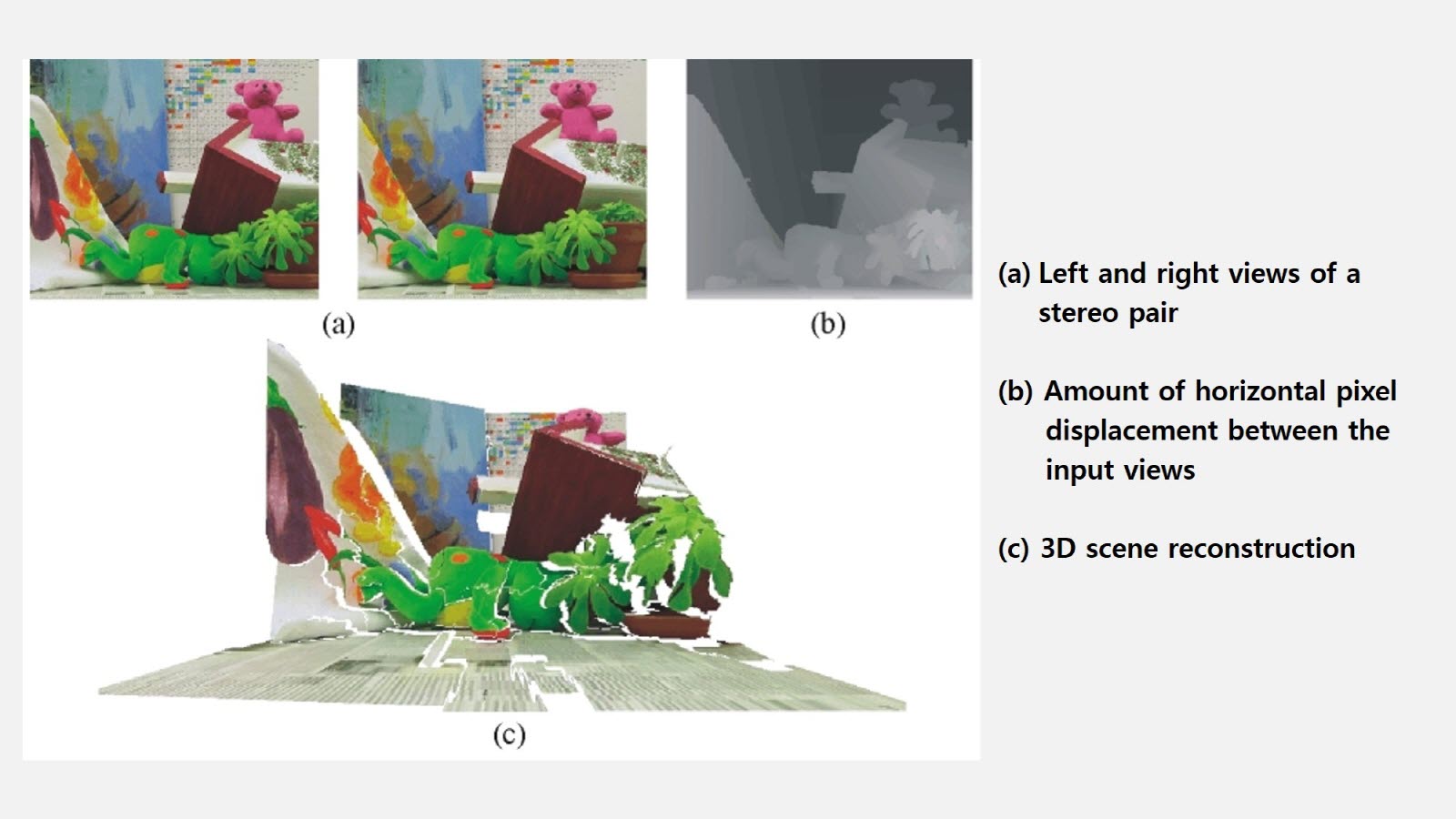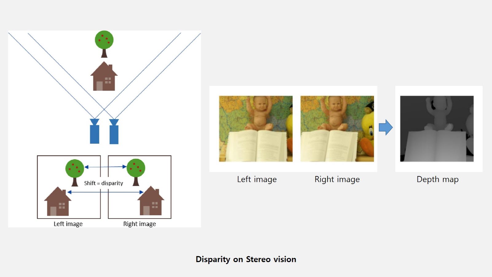 Stereo Vision 환경에서 두개의 카메라로부터 촬영된 영상에 대하여, 캘리브레이션을 통해 왜곡보정 및 rectification을 수행, 스테레오 매칭으로 두 영상간의 서로 대응되는 픽셀과 그 시차(disparity)를 이용해 Depth Map을 생성함.